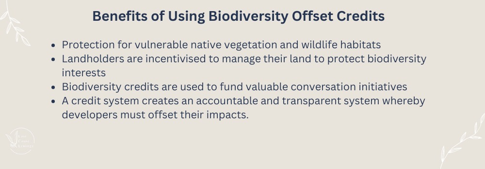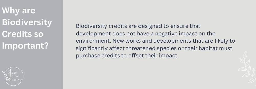 At their core, biodiversity credits are designed to ensure that development does not have a net negative impact on the environment. That means that new works and developments that are likely to significantly affect threatened species or their habitat must purchase credits to offset their impact through this process.