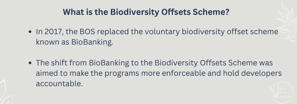 In NSW, the Biodiversity Offsets Scheme (BOS) was established under the Biodiversity Conservation Act 2016 (NSW) which commenced on 25 August 2017 and replaced the voluntary biodiversity offset scheme known as BioBanking.